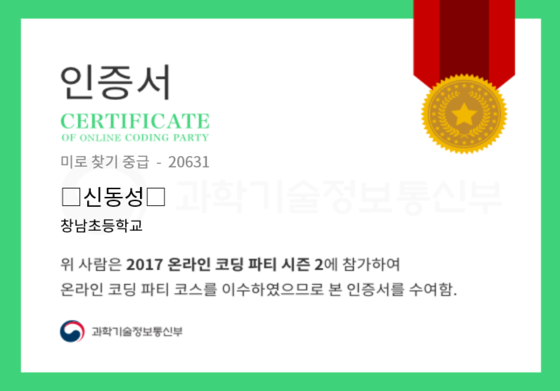 온라인 코딩 파티 참여하고 미션에 성공해 인증서를 받아보세요. 미션을 완료하면서 받은 인증서를 ‘인증서 자랑하기’에 등록해 주세요.