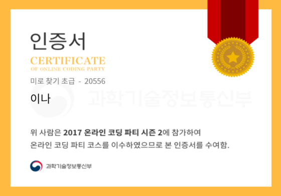 온라인 코딩 파티 참여하고 미션에 성공해 인증서를 받아보세요. 미션을 완료하면서 받은 인증서를 ‘인증서 자랑하기’에 등록해 주세요.
