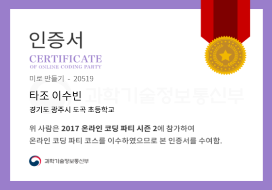 온라인 코딩 파티 참여하고 미션에 성공해 인증서를 받아보세요. 미션을 완료하면서 받은 인증서를 ‘인증서 자랑하기’에 등록해 주세요.