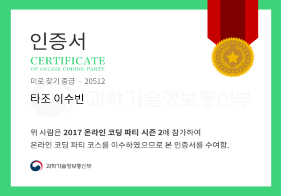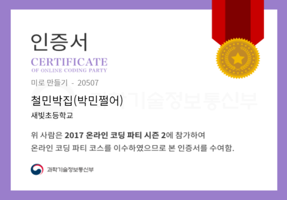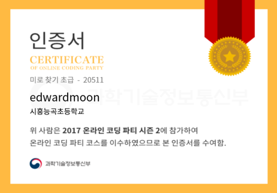 온라인 코딩 파티 참여하고 미션에 성공해 인증서를 받아보세요. 미션을 완료하면서 받은 인증서를 ‘인증서 자랑하기’에 등록해 주세요.
