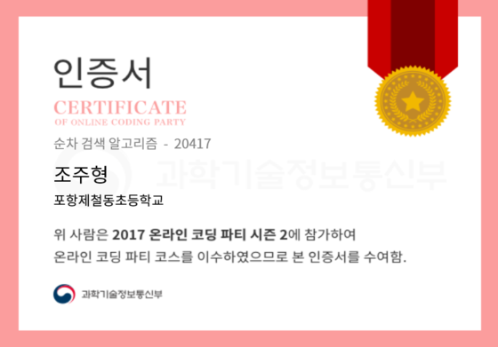 온라인 코딩 파티 참여하고 미션에 성공해 인증서를 받아보세요. 미션을 완료하면서 받은 인증서를 ‘인증서 자랑하기’에 등록해 주세요.