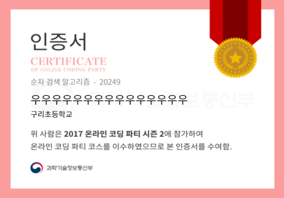 온라인 코딩 파티 참여하고 미션에 성공해 인증서를 받아보세요. 미션을 완료하면서 받은 인증서를 ‘인증서 자랑하기’에 등록해 주세요.