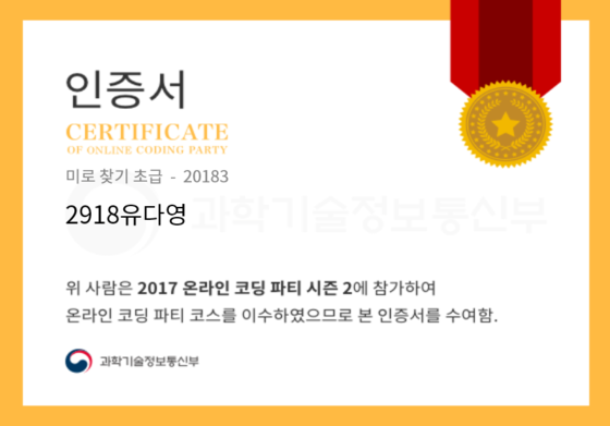 온라인 코딩 파티 참여하고 미션에 성공해 인증서를 받아보세요. 미션을 완료하면서 받은 인증서를 ‘인증서 자랑하기’에 등록해 주세요.