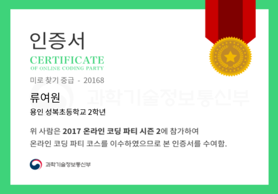 온라인 코딩 파티 참여하고 미션에 성공해 인증서를 받아보세요. 미션을 완료하면서 받은 인증서를 ‘인증서 자랑하기’에 등록해 주세요.