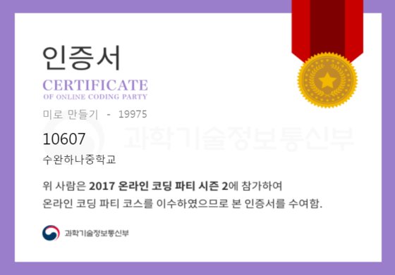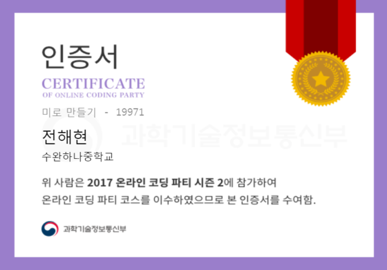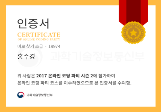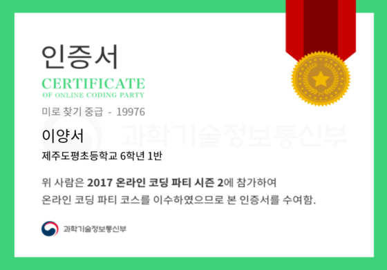 온라인 코딩 파티 참여하고 미션에 성공해 인증서를 받아보세요. 미션을 완료하면서 받은 인증서를 ‘인증서 자랑하기’에 등록해 주세요.