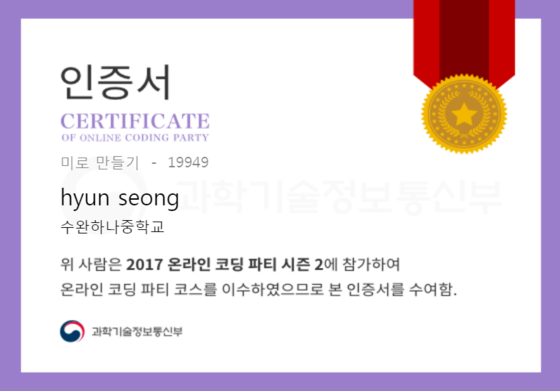 온라인 코딩 파티 참여하고 미션에 성공해 인증서를 받아보세요. 미션을 완료하면서 받은 인증서를 ‘인증서 자랑하기’에 등록해 주세요.
