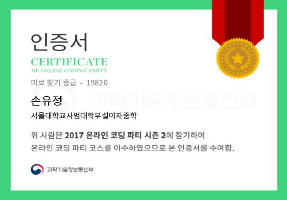 온라인 코딩 파티 참여하고 미션에 성공해 인증서를 받아보세요. 미션을 완료하면서 받은 인증서를 ‘인증서 자랑하기’에 등록해 주세요.