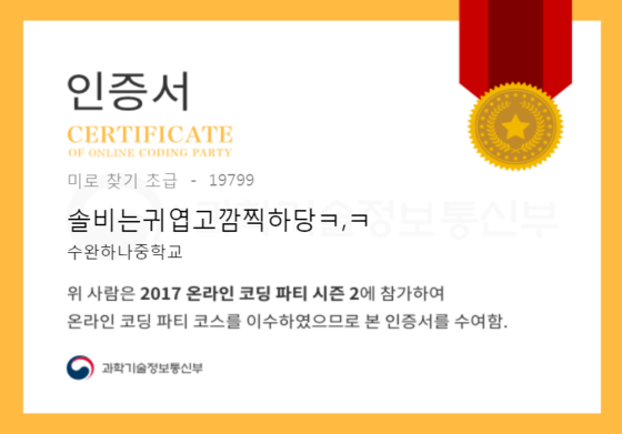 온라인 코딩 파티 참여하고 미션에 성공해 인증서를 받아보세요. 미션을 완료하면서 받은 인증서를 ‘인증서 자랑하기’에 등록해 주세요.