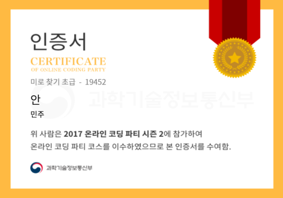 온라인 코딩 파티 참여하고 미션에 성공해 인증서를 받아보세요. 미션을 완료하면서 받은 인증서를 ‘인증서 자랑하기’에 등록해 주세요.
