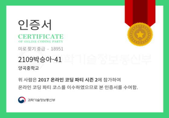 온라인 코딩 파티 참여하고 미션에 성공해 인증서를 받아보세요. 미션을 완료하면서 받은 인증서를 ‘인증서 자랑하기’에 등록해 주세요.