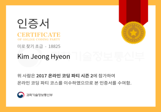 온라인 코딩 파티 참여하고 미션에 성공해 인증서를 받아보세요. 미션을 완료하면서 받은 인증서를 ‘인증서 자랑하기’에 등록해 주세요.