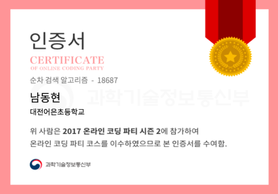 온라인 코딩 파티 참여하고 미션에 성공해 인증서를 받아보세요. 미션을 완료하면서 받은 인증서를 ‘인증서 자랑하기’에 등록해 주세요.