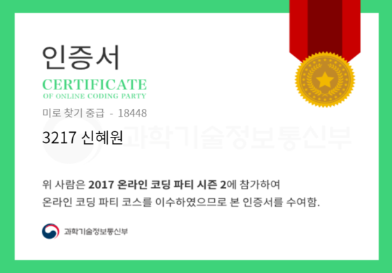 온라인 코딩 파티 참여하고 미션에 성공해 인증서를 받아보세요. 미션을 완료하면서 받은 인증서를 ‘인증서 자랑하기’에 등록해 주세요.