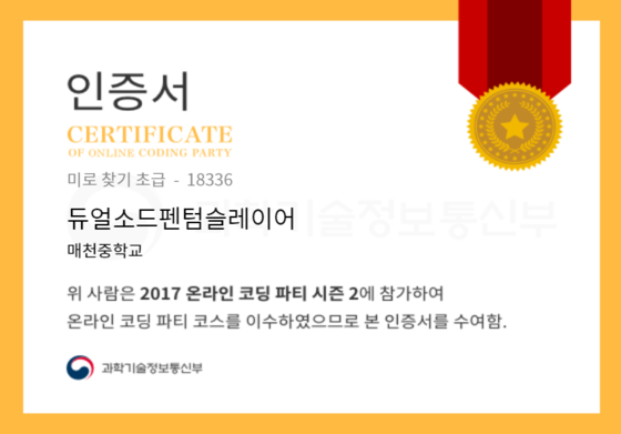온라인 코딩 파티 참여하고 미션에 성공해 인증서를 받아보세요. 미션을 완료하면서 받은 인증서를 ‘인증서 자랑하기’에 등록해 주세요.