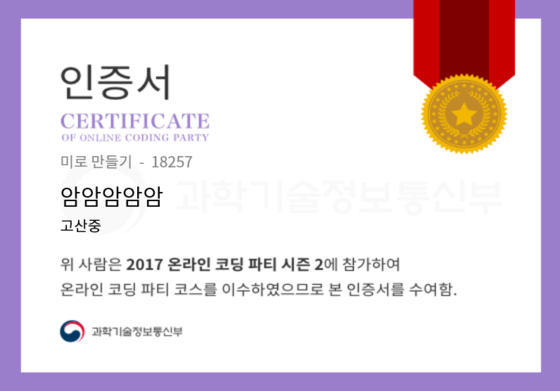 온라인 코딩 파티 참여하고 미션에 성공해 인증서를 받아보세요. 미션을 완료하면서 받은 인증서를 ‘인증서 자랑하기’에 등록해 주세요.