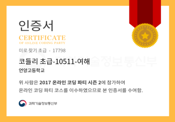 온라인 코딩 파티 참여하고 미션에 성공해 인증서를 받아보세요. 미션을 완료하면서 받은 인증서를 ‘인증서 자랑하기’에 등록해 주세요.
