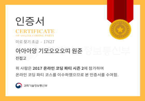 온라인 코딩 파티 참여하고 미션에 성공해 인증서를 받아보세요. 미션을 완료하면서 받은 인증서를 ‘인증서 자랑하기’에 등록해 주세요.