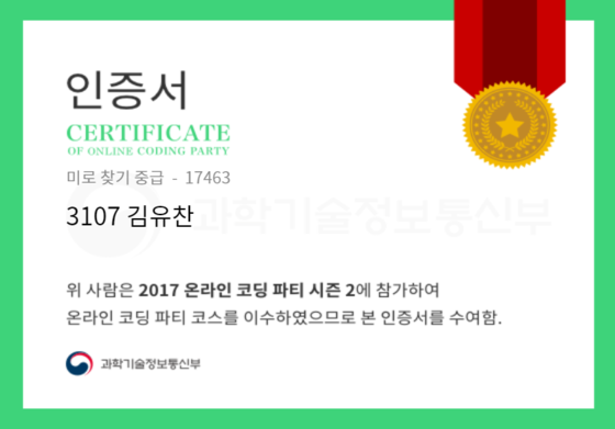 온라인 코딩 파티 참여하고 미션에 성공해 인증서를 받아보세요. 미션을 완료하면서 받은 인증서를 ‘인증서 자랑하기’에 등록해 주세요.