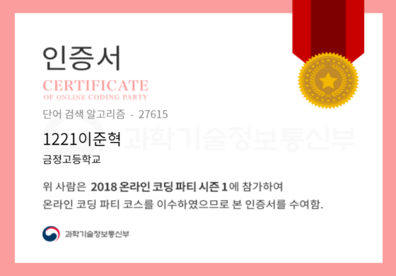 온라인 코딩 파티 참여하고 미션에 성공해 인증서를 받아보세요. 미션을 완료하면서 받은 인증서를 ‘인증서 자랑하기’에 등록해 주세요.