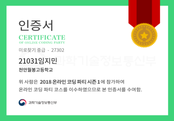 온라인 코딩 파티 참여하고 미션에 성공해 인증서를 받아보세요. 미션을 완료하면서 받은 인증서를 ‘인증서 자랑하기’에 등록해 주세요.
