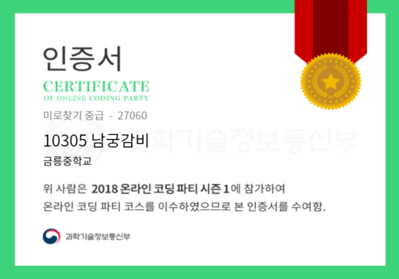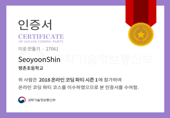 온라인 코딩 파티 참여하고 미션에 성공해 인증서를 받아보세요. 미션을 완료하면서 받은 인증서를 ‘인증서 자랑하기’에 등록해 주세요.