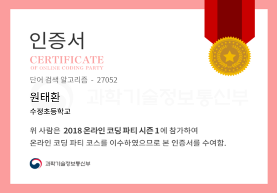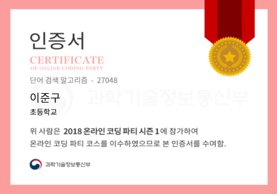온라인 코딩 파티 참여하고 미션에 성공해 인증서를 받아보세요. 미션을 완료하면서 받은 인증서를 ‘인증서 자랑하기’에 등록해 주세요.