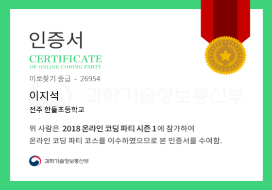 온라인 코딩 파티 참여하고 미션에 성공해 인증서를 받아보세요. 미션을 완료하면서 받은 인증서를 ‘인증서 자랑하기’에 등록해 주세요.