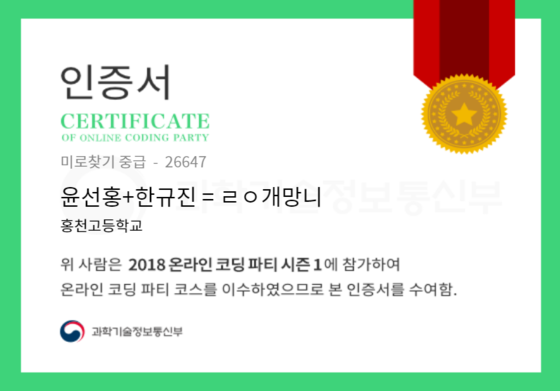 온라인 코딩 파티 참여하고 미션에 성공해 인증서를 받아보세요. 미션을 완료하면서 받은 인증서를 ‘인증서 자랑하기’에 등록해 주세요.