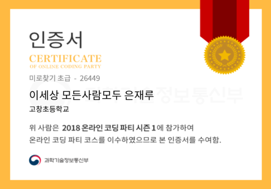 온라인 코딩 파티 참여하고 미션에 성공해 인증서를 받아보세요. 미션을 완료하면서 받은 인증서를 ‘인증서 자랑하기’에 등록해 주세요.