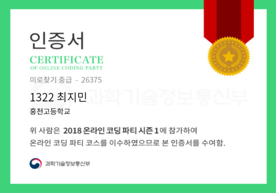 온라인 코딩 파티 참여하고 미션에 성공해 인증서를 받아보세요. 미션을 완료하면서 받은 인증서를 ‘인증서 자랑하기’에 등록해 주세요.