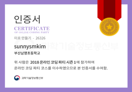 온라인 코딩 파티 참여하고 미션에 성공해 인증서를 받아보세요. 미션을 완료하면서 받은 인증서를 ‘인증서 자랑하기’에 등록해 주세요.