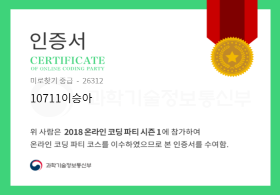 온라인 코딩 파티 참여하고 미션에 성공해 인증서를 받아보세요. 미션을 완료하면서 받은 인증서를 ‘인증서 자랑하기’에 등록해 주세요.