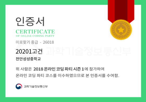 온라인 코딩 파티 참여하고 미션에 성공해 인증서를 받아보세요. 미션을 완료하면서 받은 인증서를 ‘인증서 자랑하기’에 등록해 주세요.