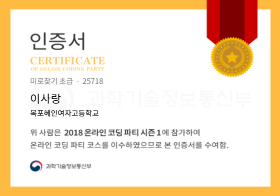 온라인 코딩 파티 참여하고 미션에 성공해 인증서를 받아보세요. 미션을 완료하면서 받은 인증서를 ‘인증서 자랑하기’에 등록해 주세요.